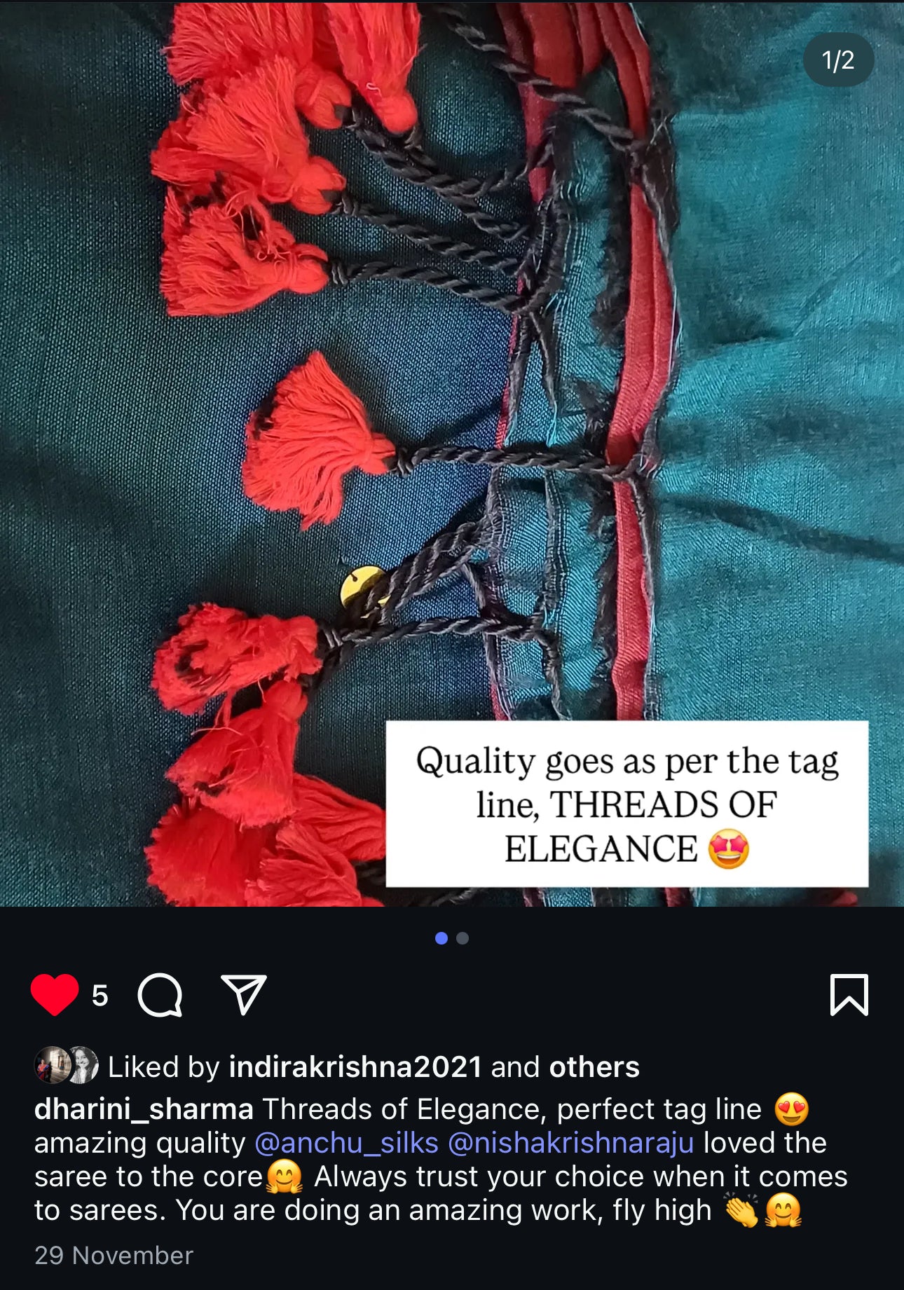“Quality truly lives up to the tagline Threads of Elegance — amazing craftsmanship and beautiful sarees loved to the core. Always a trusted choice when it comes to sarees.” ✨💖