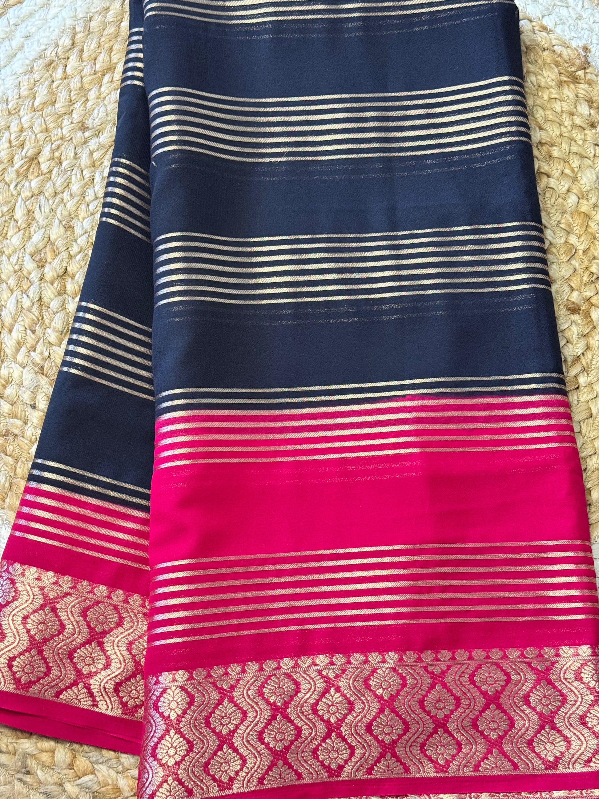 Black and Pink Semi Mysore Crepe Silk Saree Rich Pallu