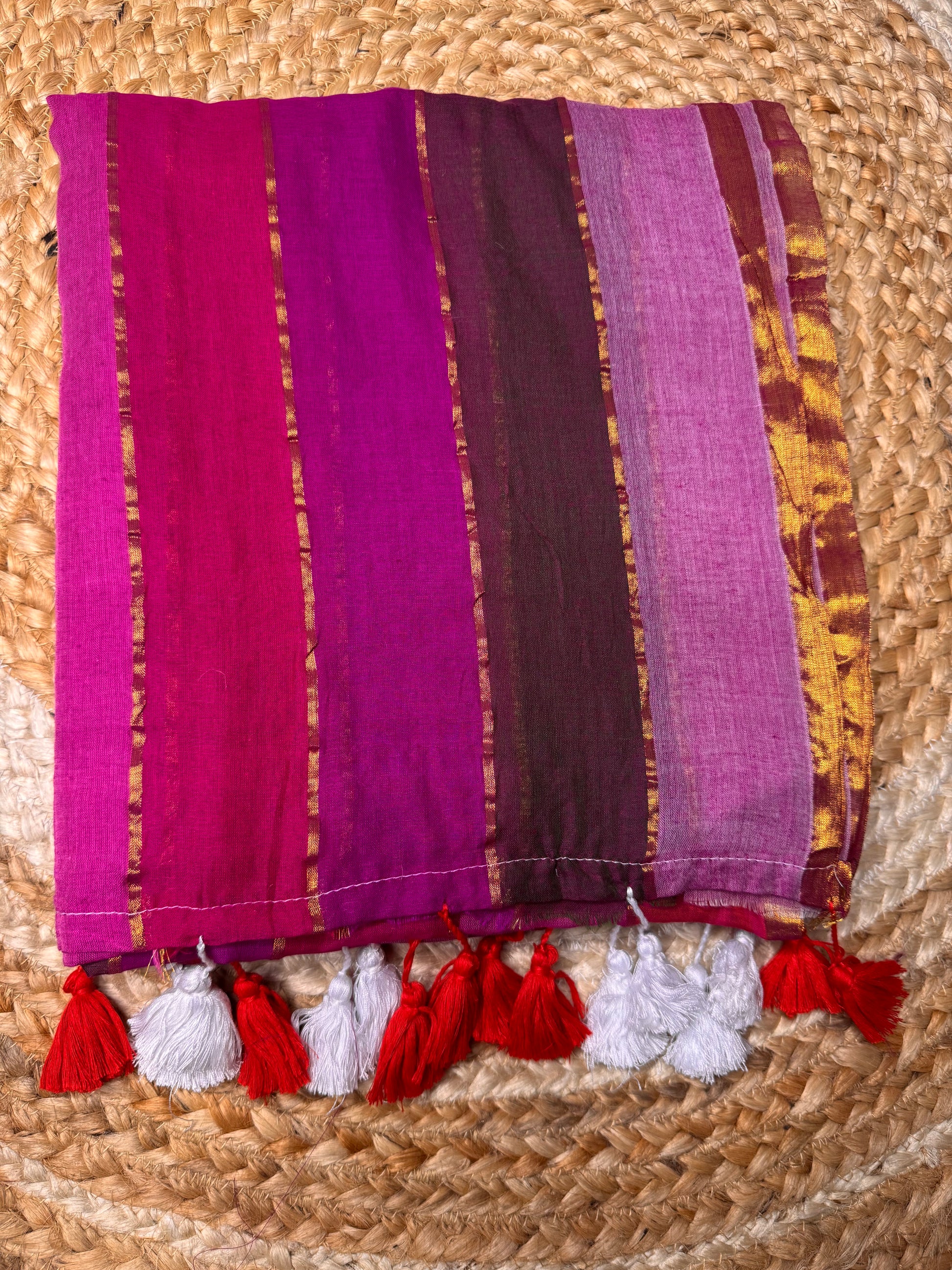 Mul cotton sarees are soft, thin and light weight wash with care. These sarees are handwoven so thread pulls, dye stains etc are common and those are not considered as damage.