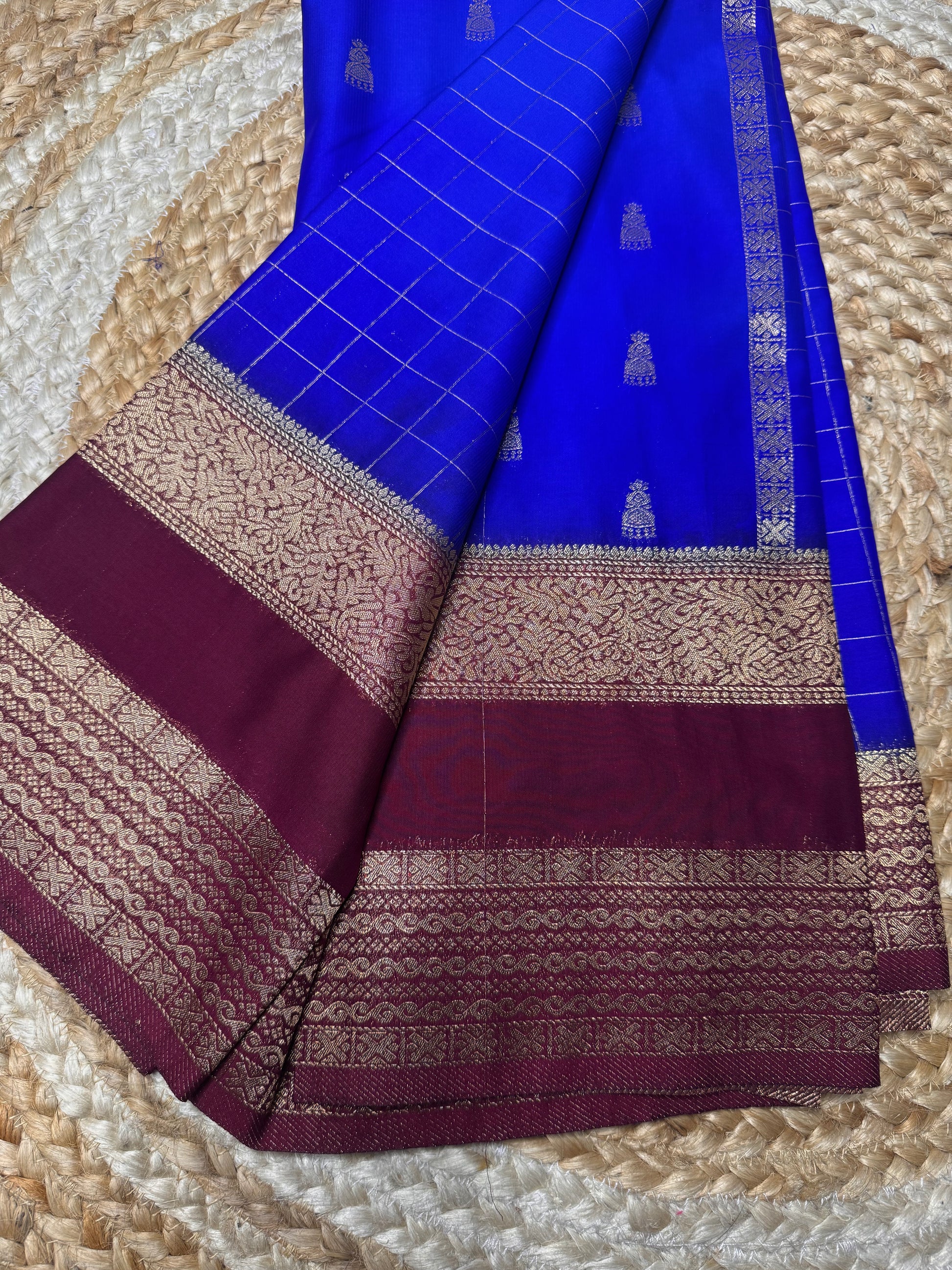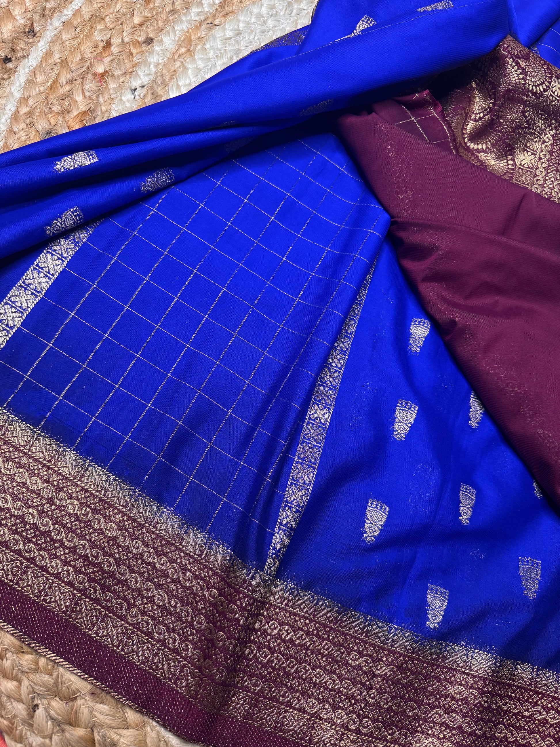 Blue with Maroon Jhumka Semi Mysore Crepe Silk