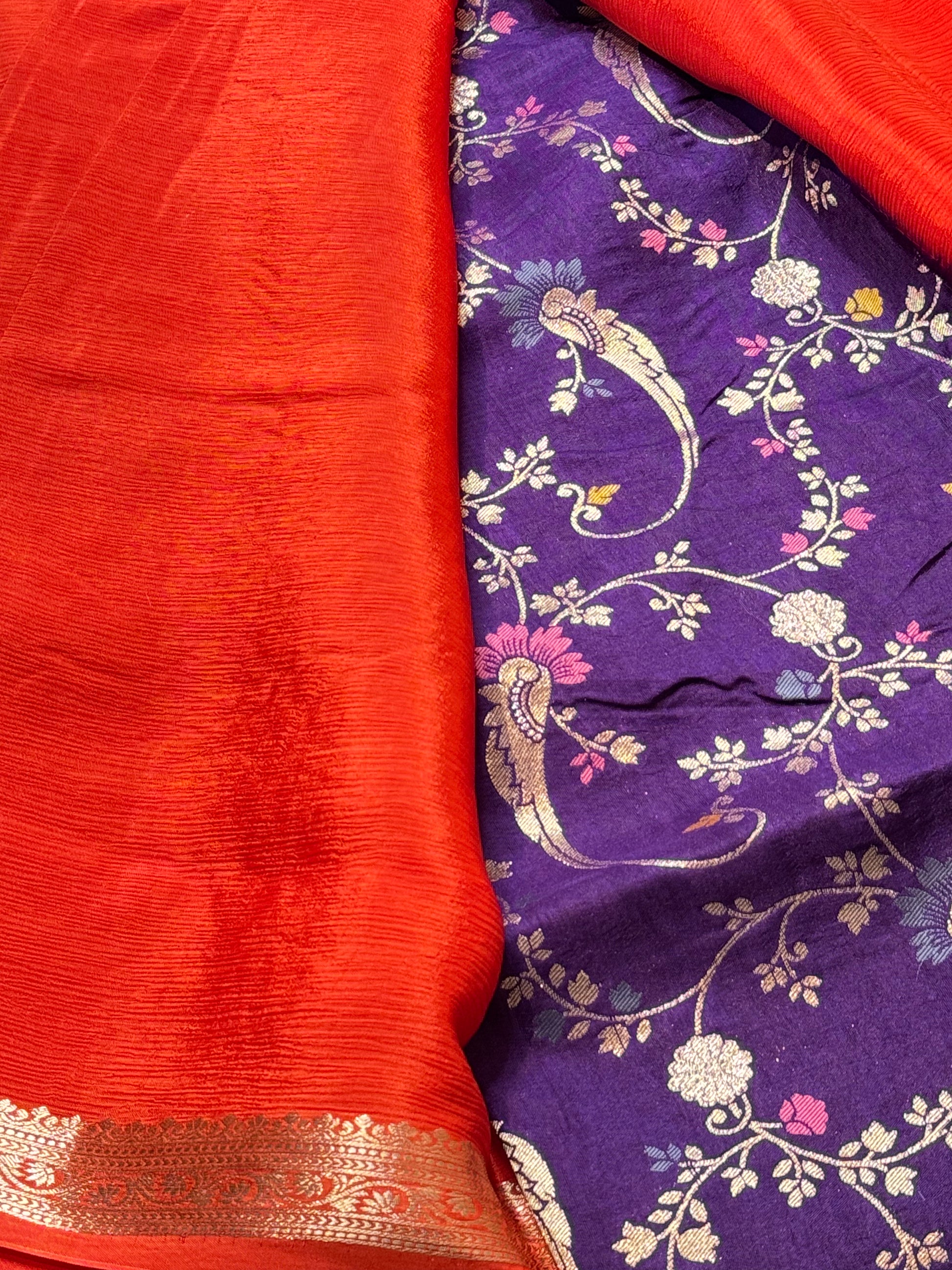 Product Description: Crushed chiffon in self colours. The saree features 1 inch golden jari floral design border, beautiful crushed design chit pallu and running blouse.
