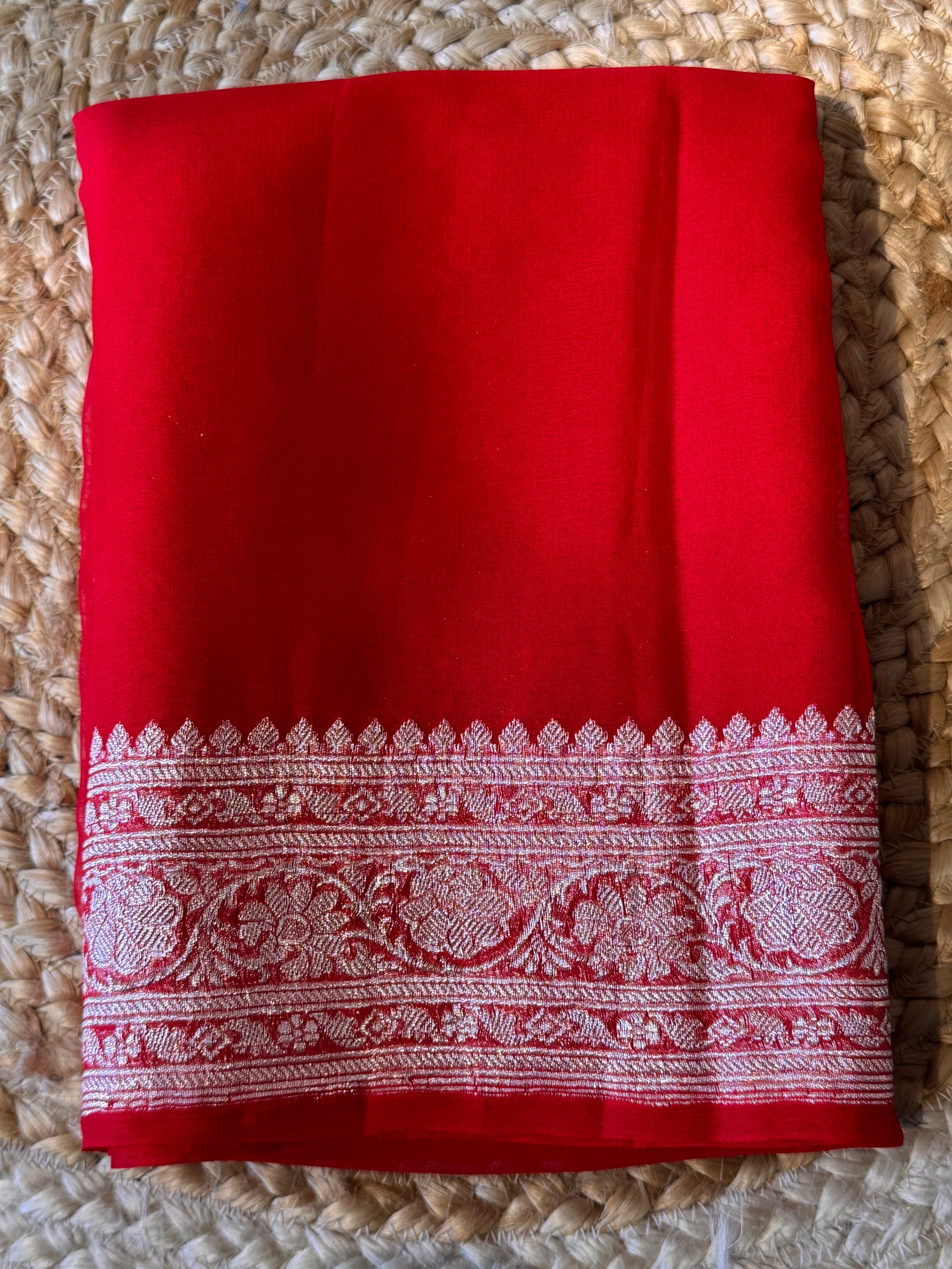 Experience the elegance of our Khadi Banaras Pure Chiffon Saree. Crafted with the finest materials, this simple yet luxurious saree offers both style and comfort. Elevate your wardrobe with this versatile and timeless piece.