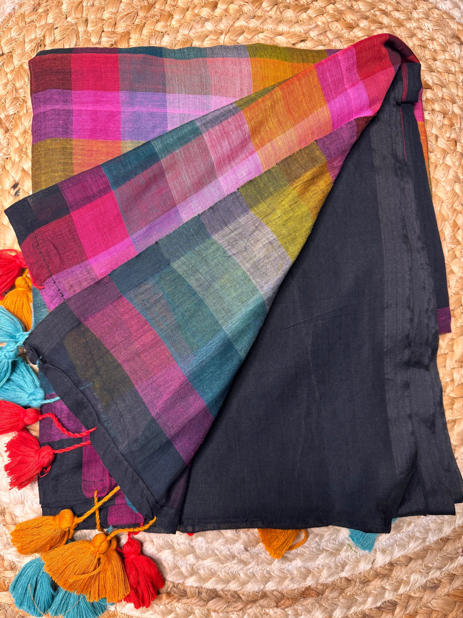 Hand Loomed and hand painted, resulting in a unique and authentic piece. This saree may contain minor thread pulls and paint stains. Please note that tassels may vary in size and color due to availability.