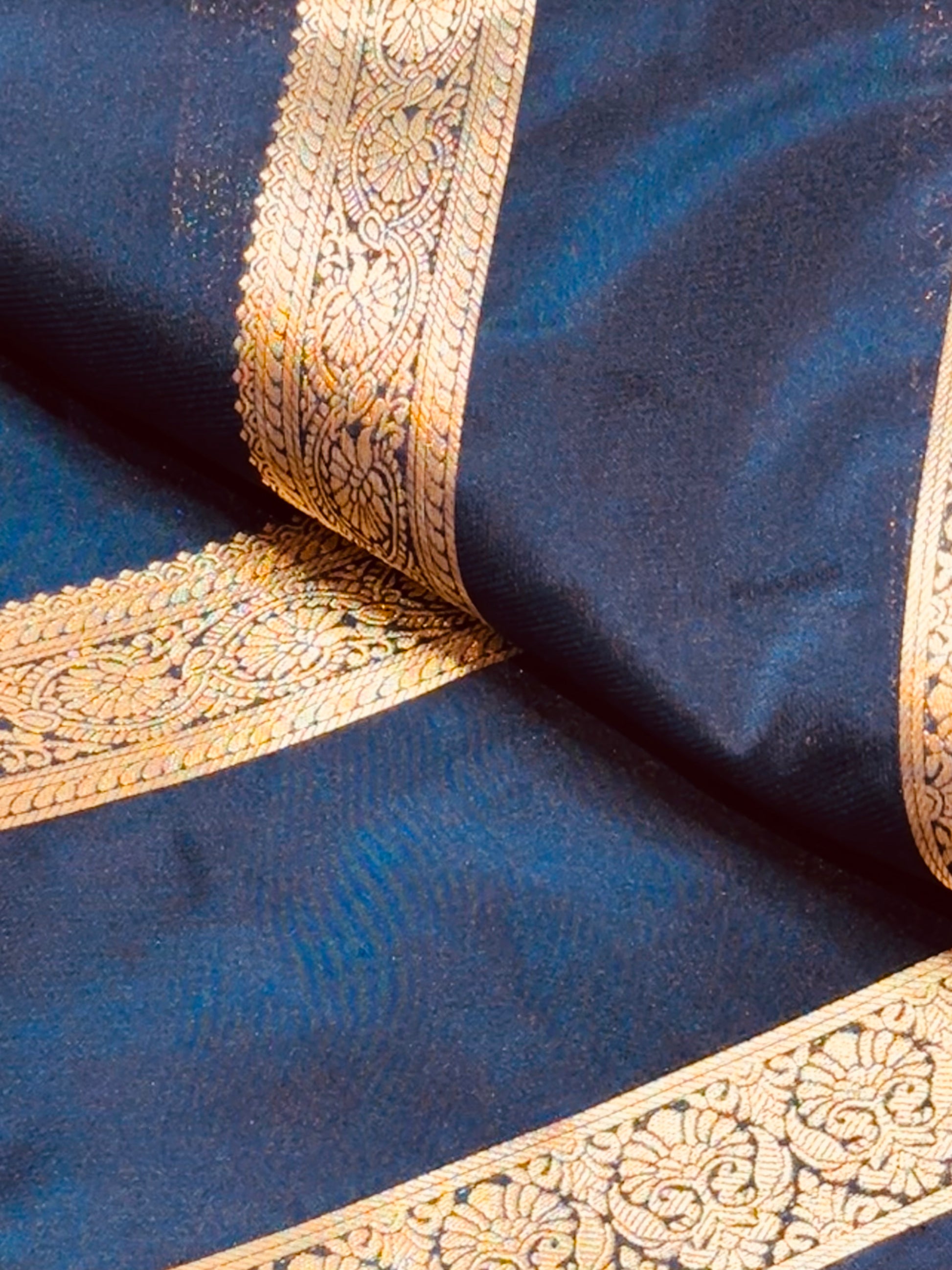 Semi Mysore Crepe in super premium crepe fabric, Self colour combinations with elegant golden jari border, perfectly spaced horizontal golden zari lines, and chit pallu.