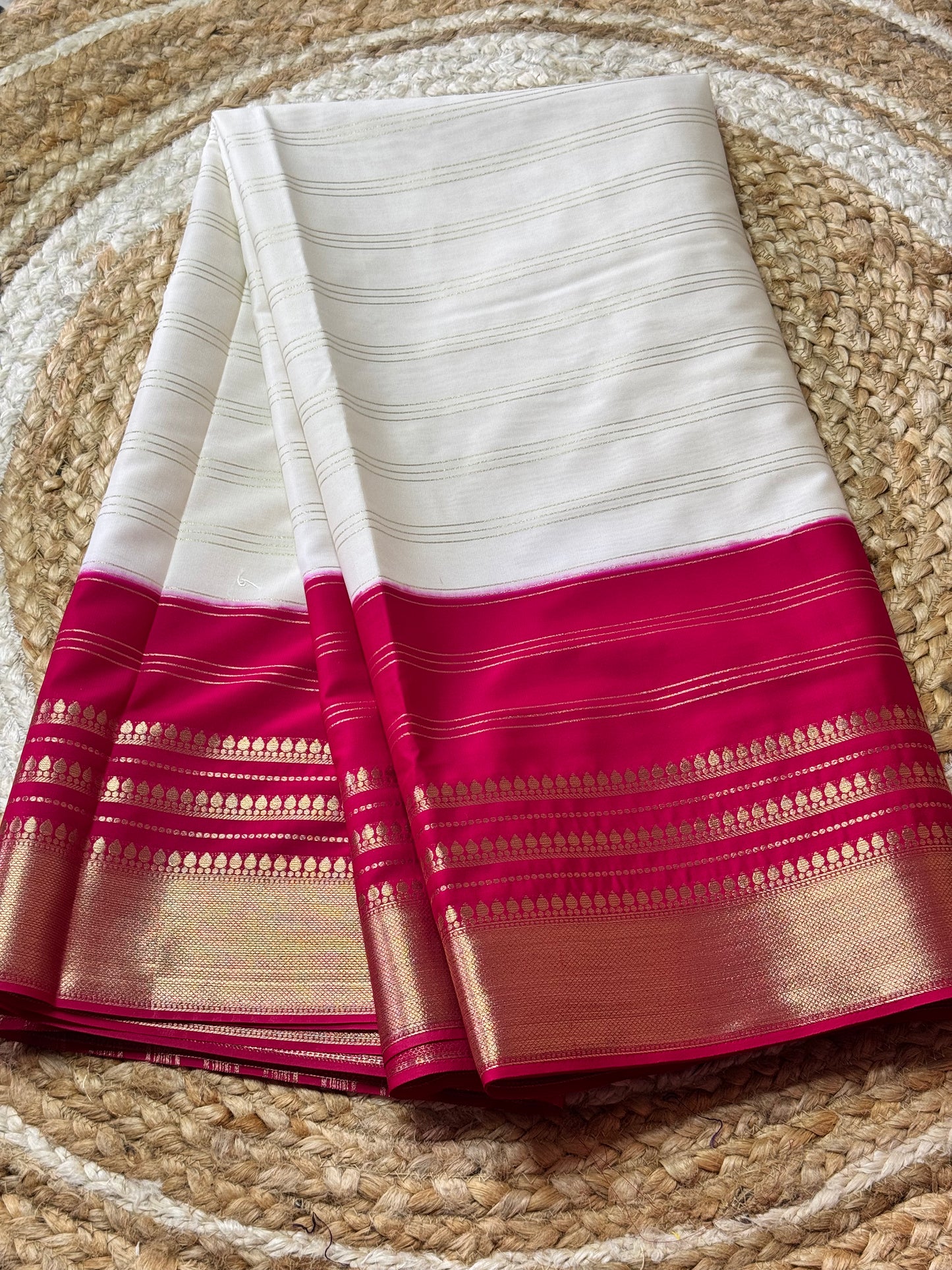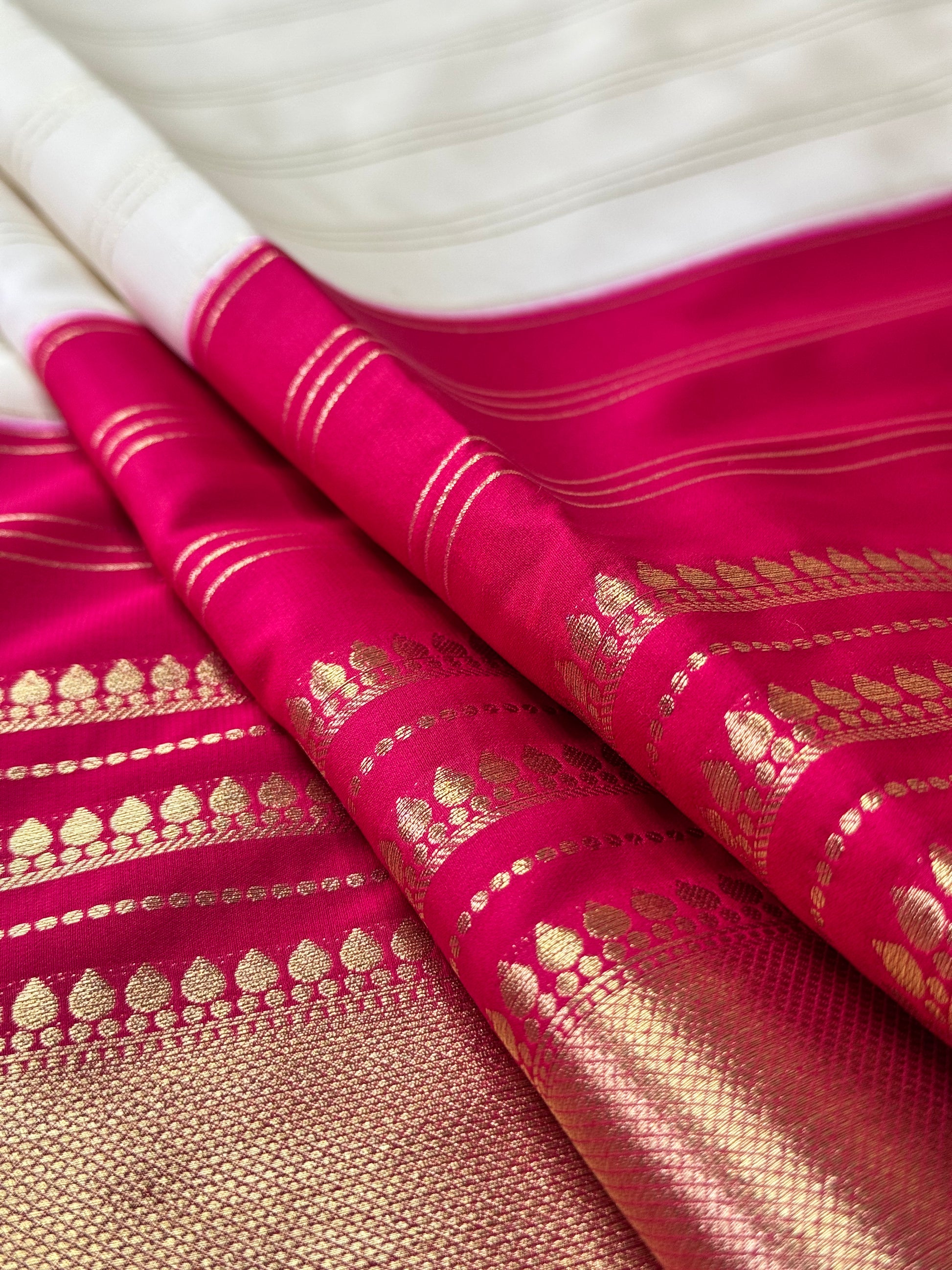 White and Pink 2D Semi Mysore Crepe Silk Saree